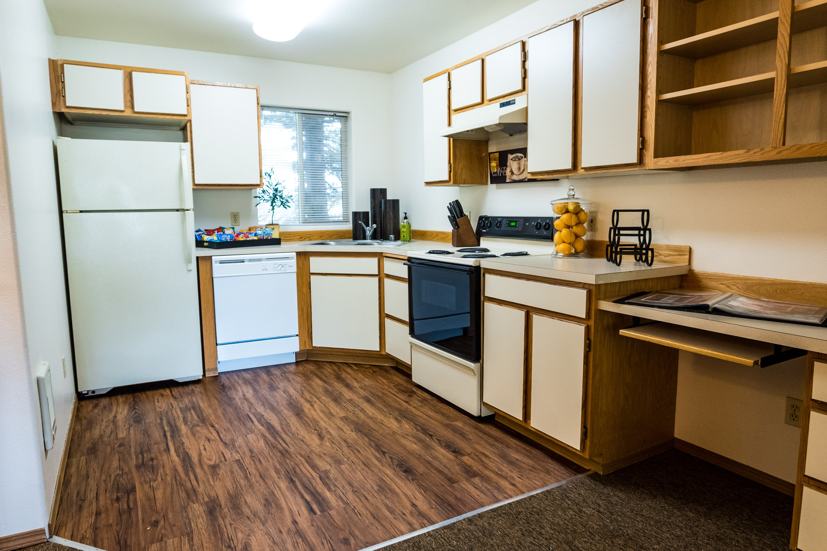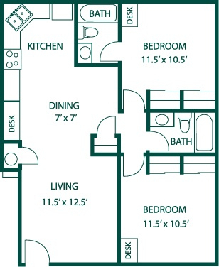 Our one-bedroom, one-bathroom apartments offer a well-designed layout within 650 square feet of living space. Each unit features an open floor plan that includes a spacious living room, a cozy dinette area, and a fully equipped kitchen with a full-sized refrigerator, range/oven, and dishwasher. The bedroom includes two closets, a small desk, and a bookshelf—perfect for both relaxation and productivity.